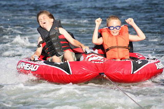 We finally spent the afternoon on John's sister Linda's party boat. We went to the lake after baseball. Jeremy said the water was a little cold but that never stops fun. He had lots of fun riding in the tube with his cousins. Uncle Eddie also let him drive the boat. This was a great way to end a long day of baseball.